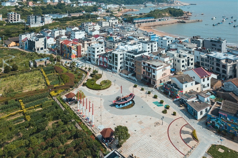 色彩斑斓的墙体渔民画,海味浓郁的风情小街,寓意为丰收的渔俗广场(见图),装饰一新的崭新民宿……每次走进田岙村,都有新惊喜。