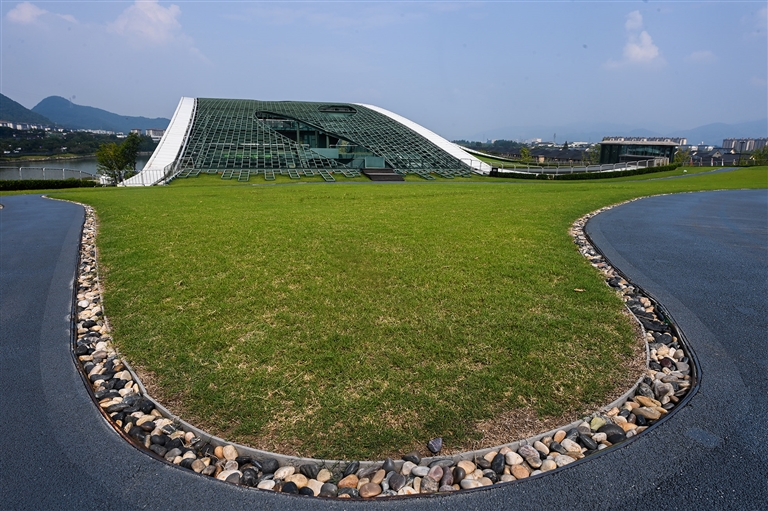 这是8月24日在杭州富阳水上运动中心拍摄的屋顶花园的草坪和步行道,雨水通过鹅卵石过滤下渗,循环利用。