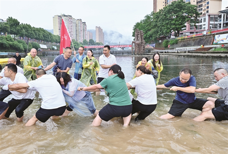 8月26日,选手们在宣恩县城贡水河上进行拔河比赛。