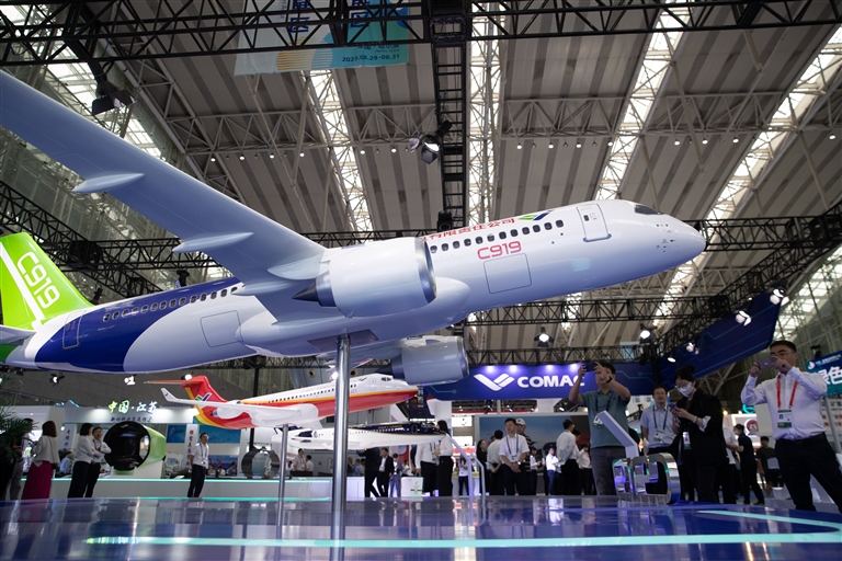 8月29日,参会者在中国商飞公司展厅拍摄C919飞机模型。