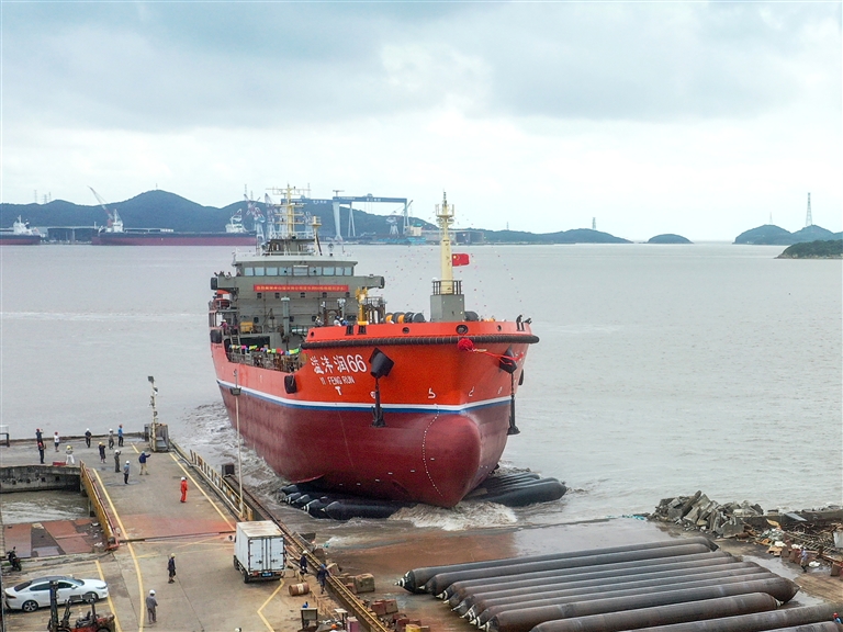 本报讯 昨天上午10时38分,位于定海干石览的舟山启帆船舶修造有限公司内,7000吨级的“舟山船型2.0版”首制船“溢沣润66”轮缓缓入水(见图)。这是国内迄今为止最大吨位的专业供油船,可同时装载两种油品,满足各种超大吨位国际航行船舶的燃油补给需求。