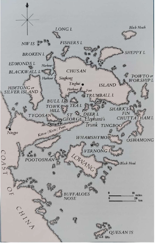 4日,星期六。所有的船都起锚了,但风几乎停息了。韦尔斯利号率先,由女王号(印度海军)拖曳,前往舟山城 [定海]。我们都尽力跟随,并在傍晚在城外抛锚。这是一个完全被陆地包围的港口,周围环绕着可爱的绿色小岛。无数载着当地人的船只毫无畏惧地穿梭来去。舟山多山,风景如画,地势低洼,种满了水稻。这些山大约有七八百英尺高,上面有很多梯田, 可以灌溉,种植茶叶、红薯等。山谷里也生长着竹子和贝叶棕。对这样一个和平宁静的国家发动战争似乎是一种耻辱……