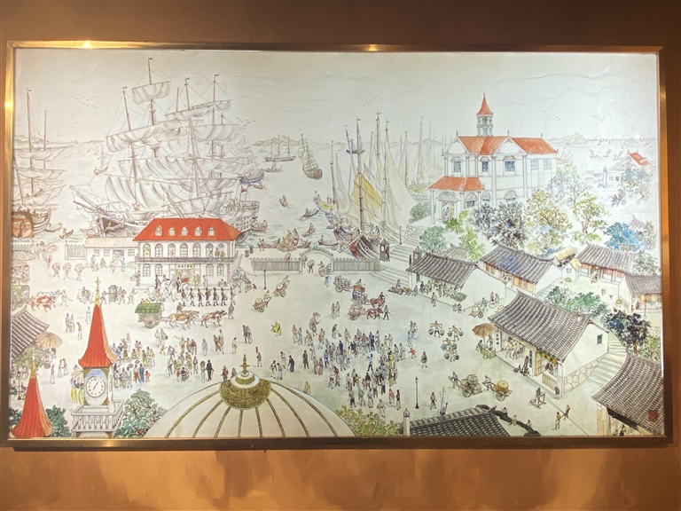 六横里岙民俗风物馆内,一幅绘画作品展示双屿古港口盛景