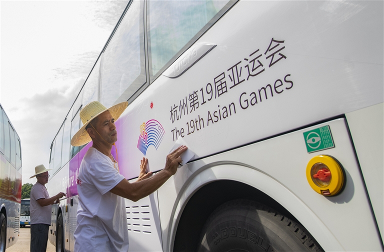 杭州亚运会临近,浙江省金华市金华公交集团三公司的工作人员给车辆贴上亚运主题车贴,为公交车换上“亚运新装”。金华市是杭州亚运会协办城市之一,将承办足球和藤球比赛。 新华社 发(时宽兵 摄)