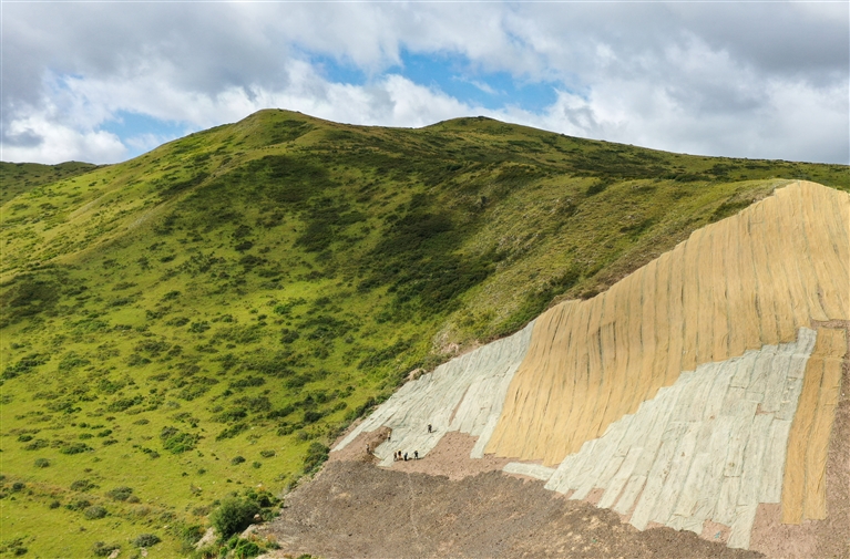 在若尔盖县达扎寺镇多玛村废弃矿山治理点,工人在边坡上铺椰丝毯(8月23日摄,无人机照片)。