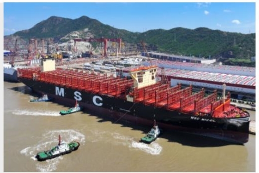 9月15日上午10时,我国自主研制的全球最大装箱量集装箱船“鑫福108”轮(24000标准箱级)顺利靠泊岱山金海船务公司4号码头。据悉,24000标准箱级集装箱船是目前全球载重量最大、装箱量最大的新一代超大型集装箱船型,船长393.92米,型宽61.3米,甲板面积达24000平方米,最大堆箱层数可达25层,堪称“海上城堡”。“鑫福108”轮在金海船务公司整休后,这艘“带货王”将在舟山交付投用。