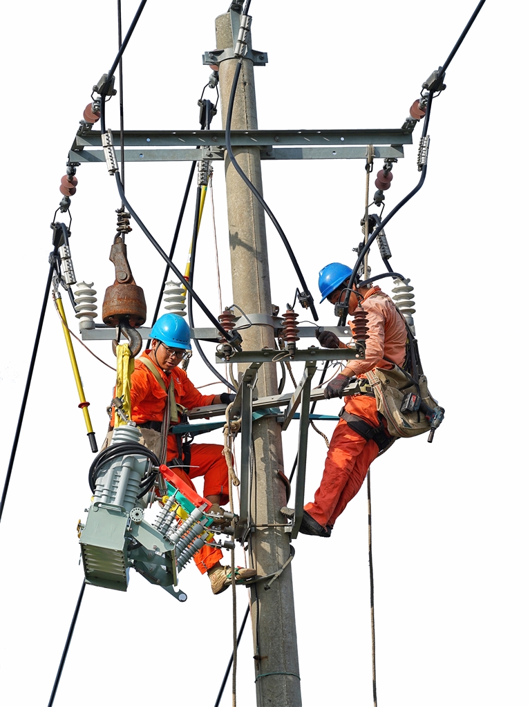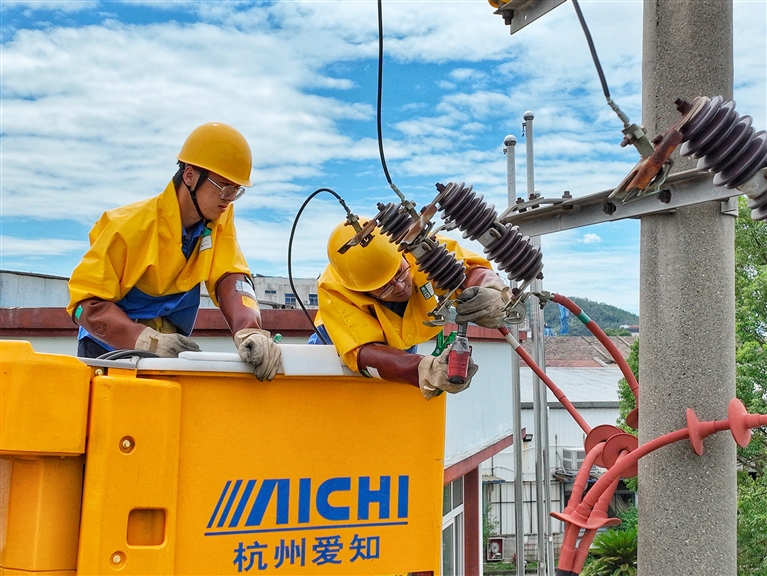 随着气象部门发布“今年暑热将超长待机”,与气温一起攀升的还有用电量,启明电建分公司积极备战,迎接又一年的夏季“大考”。今年7月初,启明电建分公司带电作业工作项目部施工人员,顶着高温在六横区域开展集中消缺抢修。在近4小时的带电作业过程中,完成了六横港兴变10千伏港盛B385线、双屿变10千伏郭围B688线等8条10千伏架空线路的直线杆改耐张杆、开关更换、更换跌落式避雷器等工作,为周边群众与企业提供安全可靠供电。