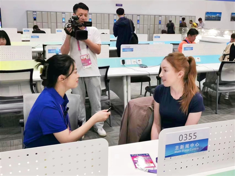 英国记者瑞贝卡接受“小竞”“小舟”的采访 摄影 记者 姚凯乐