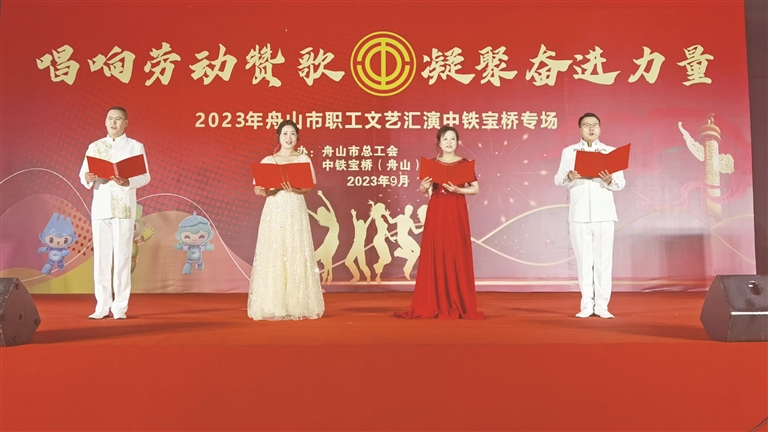 9月8日晚,“唱响劳动赞歌 凝聚奋进力量”舟山市职工文艺汇演在中铁宝桥(舟山)有限公司党建广场举行。音乐说唱、二胡独奏、舞蹈、魔术等节目轮番上演,百余名职工参与观看,看到精彩处,不时传来喝彩声,不少职工拿出手机拍摄。