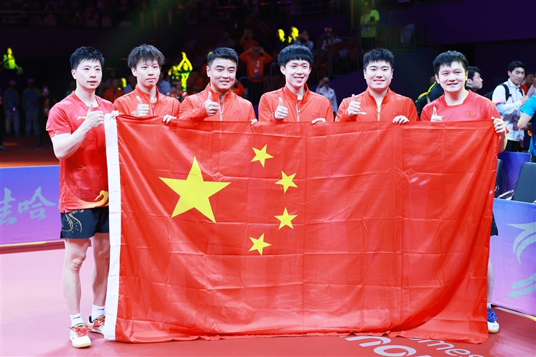 ▲9月26日,中国队选手马龙、林高远、教练员王皓、选手王楚钦、梁靖昆、樊振东(从左至右)在比赛后手举国旗庆祝。当日,杭州亚运会乒乓球项目男子团体决赛在杭州拱墅运河体育公园体育馆举行,中国队以3比0战胜韩国队,获得金牌。 新华社记者 刘续 摄