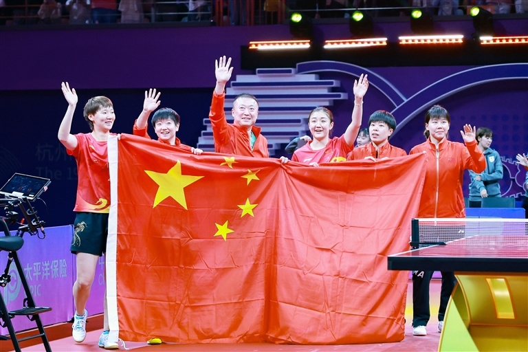 ▲9月26日,中国队选手王曼昱、孙颖莎、教练员马琳、选手陈梦、王艺迪、陈幸同(从左至右)在夺冠后庆祝。当日,在杭州亚运会乒乓球项目女子团体决赛中,中国队以3比0战胜日本队,夺得冠军。