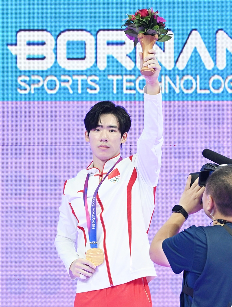 ▲9月26日,张博恒在领奖台上。当日,在杭州亚运会竞技体操男子全能决赛中,中国选手张博恒以总得分89.299的成绩夺得冠军。