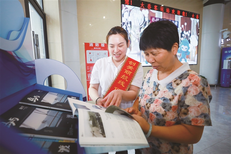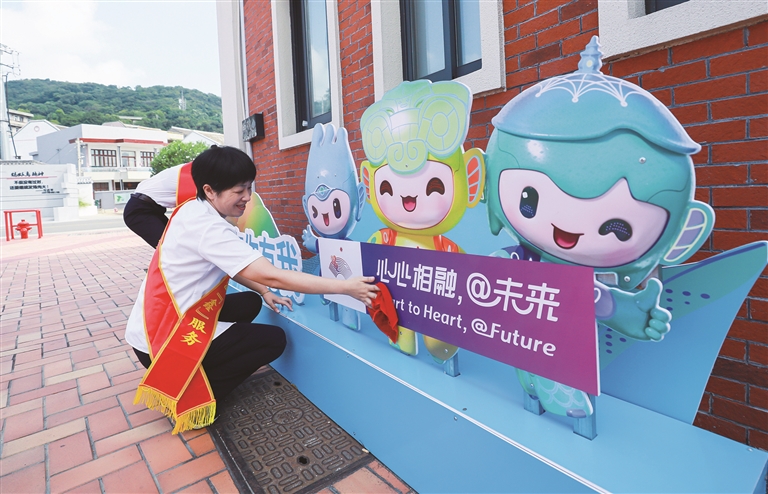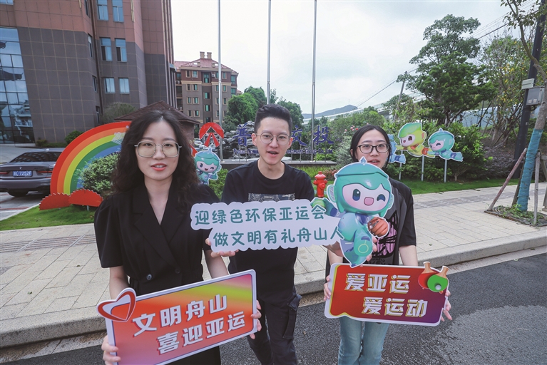 在普陀,诸多码头上、客轮里以及海岛公交内,亚运元素以景观小品、宣传视频等各种形式迎面而来,亚运氛围感拉满。在利用对外窗口,为亚运添彩的同时,普陀交投集团对内,在本部大楼,带有吉祥物、口号等元素的“亚运妆”随处可见。