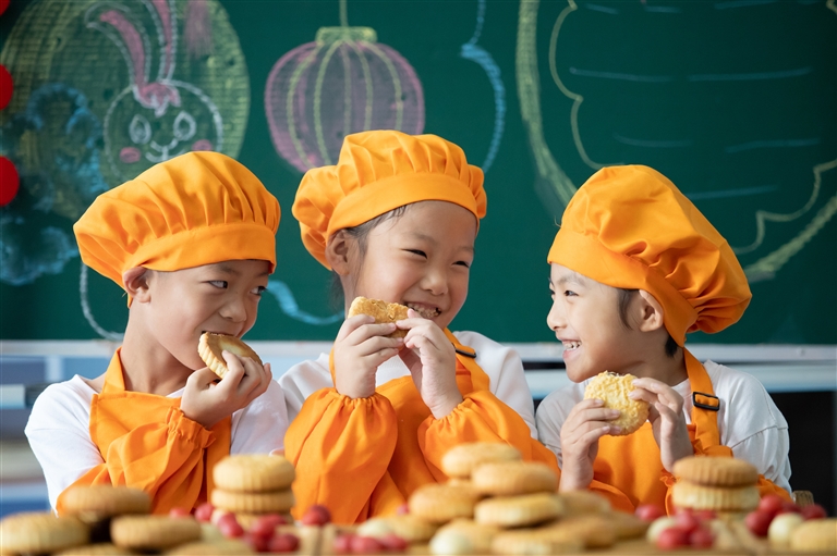 9月27日,河北省邯郸市肥乡区肥乡镇第二幼儿园的小朋友在品尝自己亲手制作的月饼。中秋节将至,各地小朋友用不同的方式了解传统文化,迎接中秋佳节。 新华社 发(薛建东 摄)