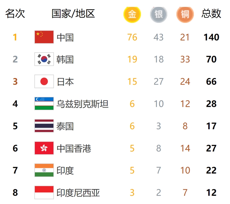 新华社杭州9月27日电 杭州第十九届亚洲运动会9月27日奖牌统计(按参赛代表团、金牌、银牌、铜牌和奖牌总数排列):