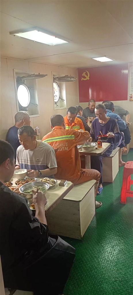 “今夜给船员放假休息,船上安排聚餐,一起过中秋迎国庆,高兴高兴!”记者的微信上,传来“宁泰52”船长刘忠德发来的两张照片。画面上,船员们正举杯畅饮,开心聚餐过节。