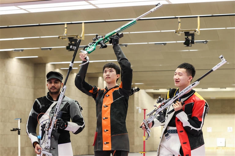 9月29日,中国选手杜林澍(中)、田珈铭(右)与印度选手艾什瓦里·普拉塔普·辛格·托马尔在比赛后。当日,在杭州亚运会射击项目男子50米步枪3种姿势个人决赛中,中国选手杜林澍获得金牌,印度选手艾什瓦里·普拉塔普·辛格·托马尔获得银牌,中国选手田珈铭获得铜牌。新华社记者 单宇琦 摄