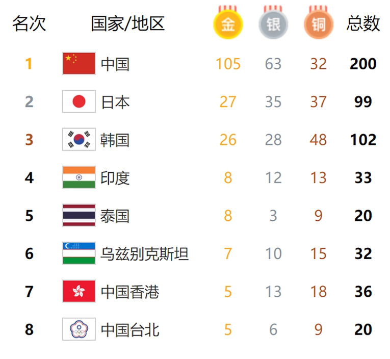 新华社杭州9月29日电 杭州第十九届亚洲运动会9月29日奖牌统计(按参赛代表团、金牌、银牌、铜牌和奖牌总数排列):