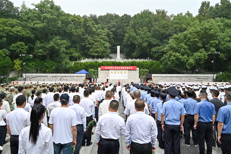 当天上午9时,军地领导来到烈士陵园,在烈士纪念碑前肃立。我市近700名各界代表手持鲜花,面向纪念碑列队肃立。队伍前,市四套班子和驻舟部队敬献的5个大型花篮一字排开,两幅写着“缅怀革命先烈 传承红色基因”“深入实施八八战略 建设现代海洋城市”的标语分外醒目。