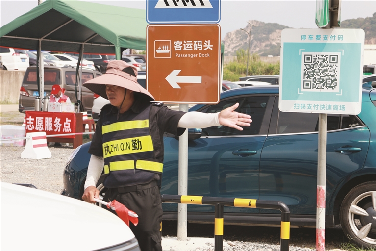 上午10时许,在普陀山码头入口处,停车场引导员、52岁的河南人老李(见图)正在执勤点执勤。