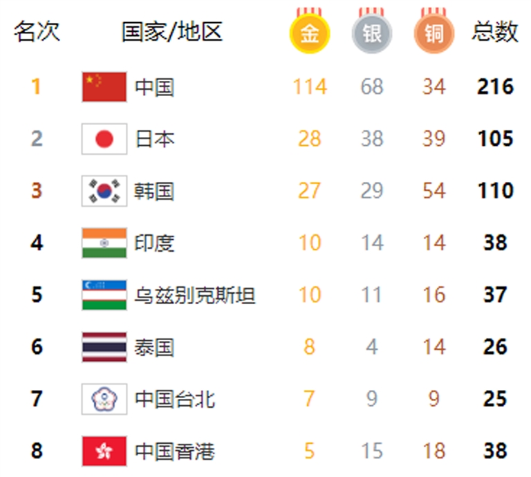 新华社杭州9月30日电 杭州第十九届亚洲运动会9月30日奖牌统计(按参赛代表团、金牌、银牌、铜牌和奖牌总数排列):