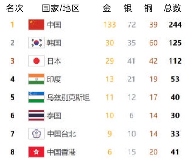 新华社杭州10月1日电 杭州第十九届亚洲运动会10月1日奖牌统计(按参赛代表团、金牌、银牌、铜牌和奖牌总数排列):