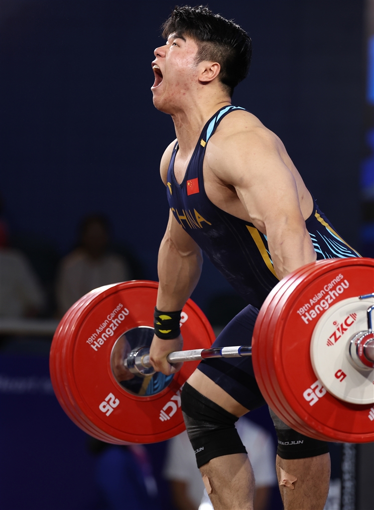 10月6日,刘焕华在比赛中。当日,在杭州亚运会举重项目男子109公斤级A组比赛中,中国选手刘焕华以抓举185公斤、挺举233公斤、总成绩418公斤获得冠军。乌兹别克斯坦选手阿克巴尔·朱拉耶夫和鲁斯兰·努鲁季诺夫分获二、三名。 新华社记者 杨磊 摄