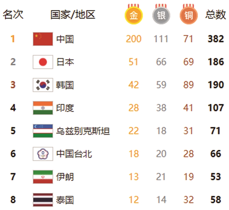 新华社杭州10月7日电 杭州第十九届亚洲运动会10月7日奖牌统计(按参赛代表团、金牌、银牌、铜牌和奖牌总数排列):