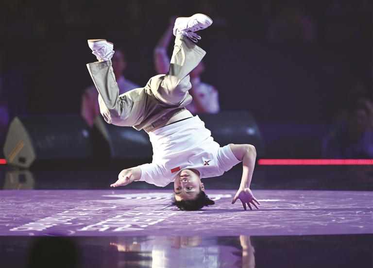 10月7日,中国选手刘清漪在比赛中。当日,在杭州亚运会霹雳舞项目女子组金牌赛中,中国选手刘清漪以2比1战胜日本选手汤浅亚美,获得冠军。