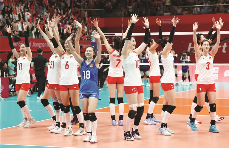 10月7日,中国队球员向观众致意。当日,在杭州亚运会女子排球决赛中,中国队以3比0战胜日本队,获得冠军。