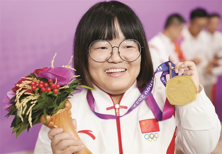 10月7日,中国选手左文静在颁奖仪式后展示金牌。当日,杭州亚运会象棋女子个人决赛在杭州棋院(智力大厦)棋类馆举行,中国选手左文静战胜中国选手王琳娜获得金牌,新加坡选手吴兰香获得铜牌。新华社记者 韩传号 摄