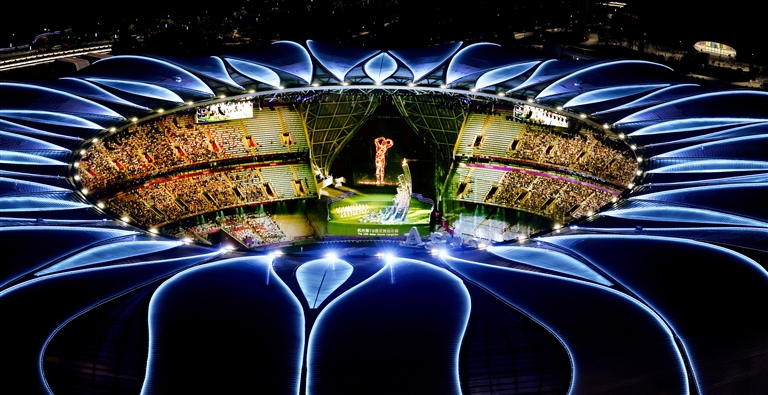 钱塘江畔,夜幕下的杭州奥体中心体育场流光溢彩,宛如一朵美丽的“大莲花”。场内欢声笑语、歌舞飞扬。来自亚洲各国各地区的运动员相聚于此,分享属于他们的体育文化盛宴。