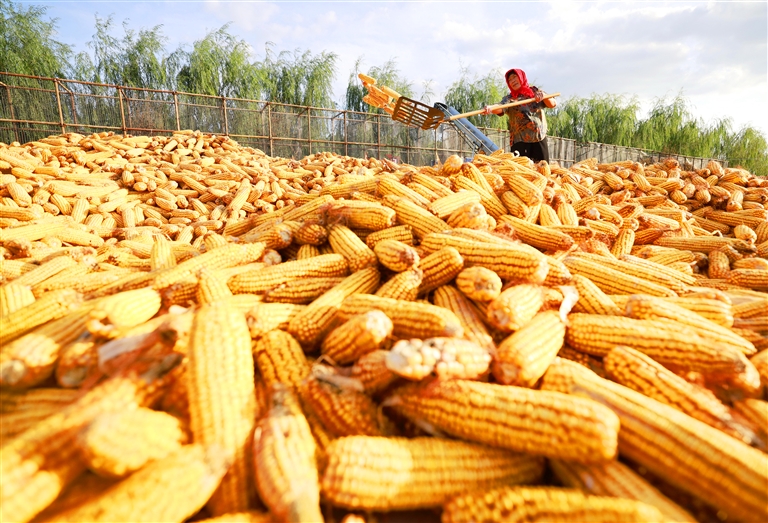 10月4日,河北唐山丰南区唐坊镇孔家庄村一名农民在晾晒玉米。眼下正值河北省秋粮收获关键时期,农民抢抓农时展开秋收作业,确保颗粒归仓。据介绍,今年该省秋粮种植面积6200万亩,其中玉米种植面积5200万亩,广袤的华北粮仓正在绘就五谷丰登的画卷。 新华社记者 杨世尧 摄
