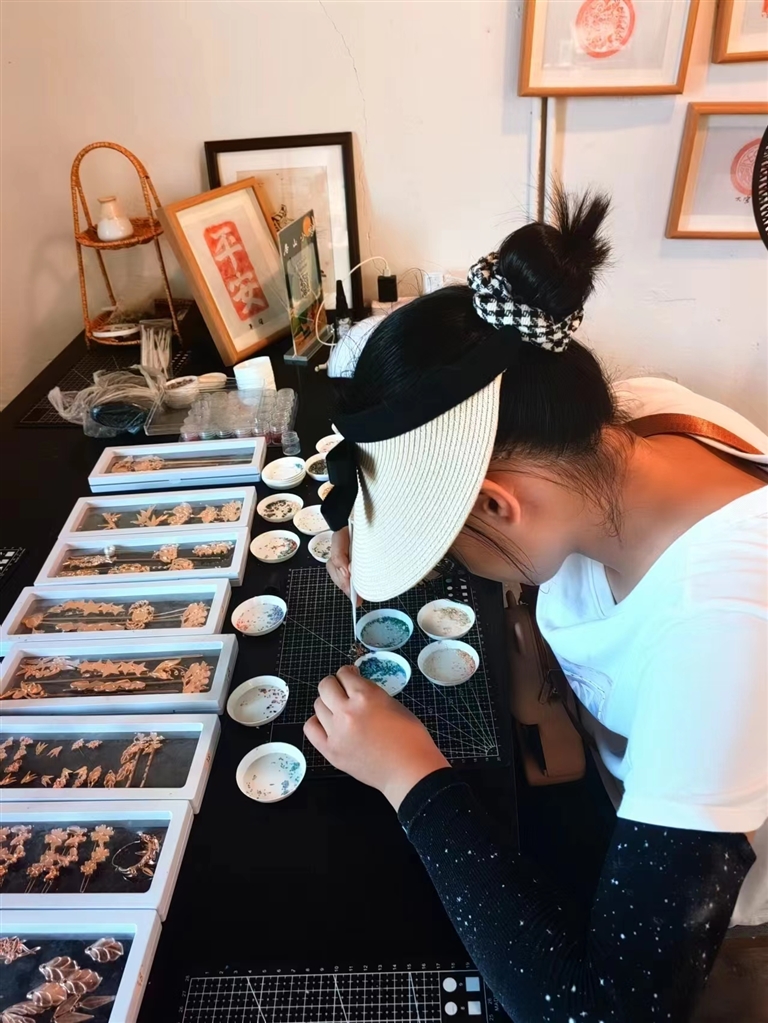 居山小院的店主青瑾坦言,让大家体验传统的螺钿镶嵌不太现实,一来技艺太过复杂,二来成本过高。所以她选取了其中的点螺元素,将其运用到制作简单饰品上,吸引受众前来体验。