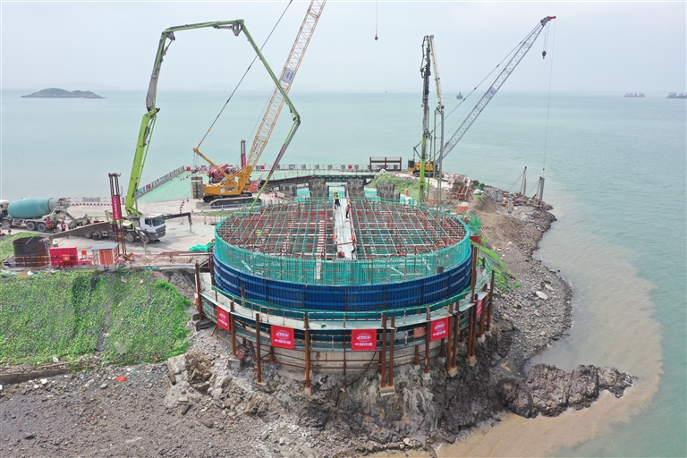 本报讯 日前,由中国铁建大桥局、中国铁建港航局联合体承建的宁波舟山港六横公路大桥二期工程双屿门特大桥六横侧主塔右幅首层承台浇筑圆满结束,标志着该大桥正式进入地上主塔承台施工阶段。这是全线首个浇筑的主桥索塔承台,将为年底主塔塔身施工奠定基础。