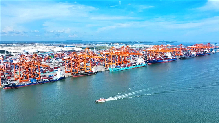 海轮在钦州港码头排队装卸货物(10月9日摄,无人机照片)。