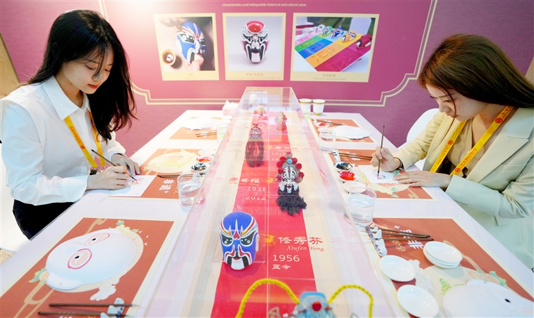 10月16日,在第三届“一带一路”国际合作高峰论坛新闻中心,媒体记者体验在明信片上画脸谱 新华社记者 王毓国 摄