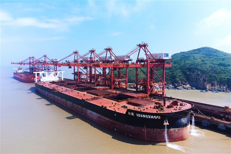 随着鼠浪湖智能化码头建设的不断推进,装卸效率越来越高,卸完一艘40万吨的矿砂船,从2016年的五六十个小时,缩短到了如今最快34.25小时。