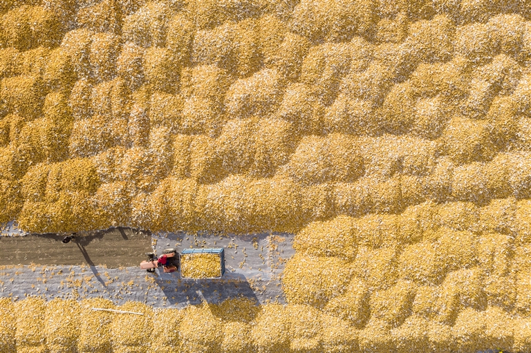 10月19日,在黑龙江省肇东市五里明镇东升村,农民把收获的玉米运到当地农业合作社指定的地点进行晾晒(无人机照片)。