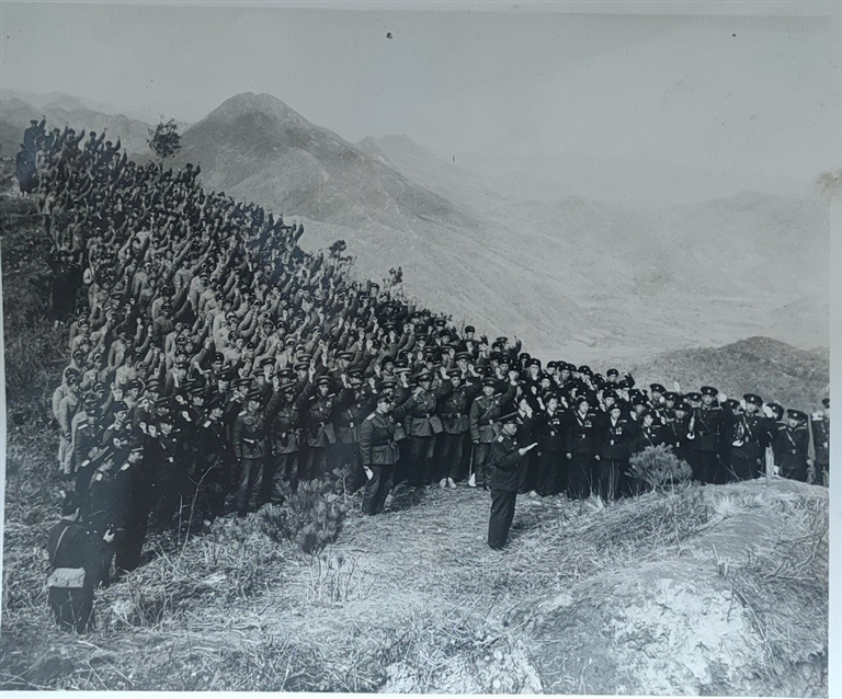 中国人民志愿军归国前向英雄高地“上甘岭”集体告别。中国人民志愿军中有多名舟山人参加了“上甘岭”战役和“长津湖”战役。