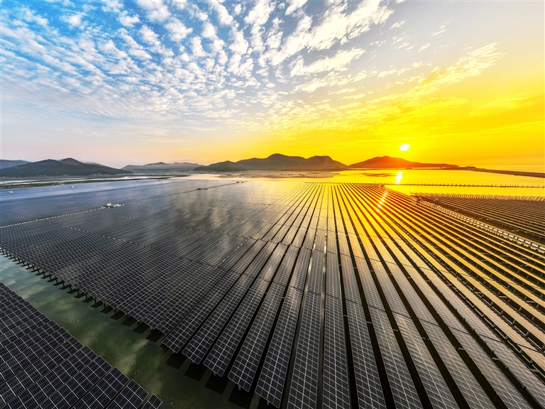 昨天清晨,岱山县大长涂岛双剑涂100兆瓦渔光互补电站的光伏面板在朝霞照映下熠熠生辉。该电站自今年6月并入国家电网以来,已累计上网电量2809万千瓦·时,根据国网舟山供电公司数据显示,截至目前,岱山县风能、光伏、潮流能等新能源总装机容量已达491.8兆瓦,同比增26%,为海岛县的绿色发展源源不断地提供着清洁能源。摄影 通讯员 姚峰 汤志成 富雨晴