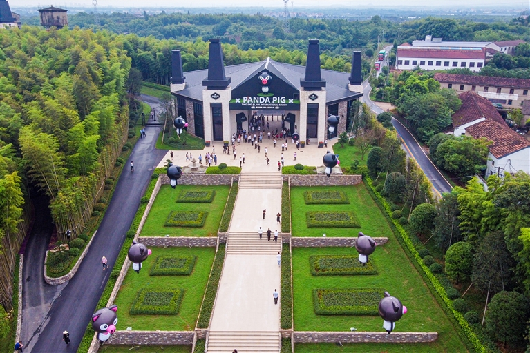 欧式风格的建筑、整洁干净的漫步道,苍苍竹林与成片茶山相得益彰。作为全球首家以金华“两头乌”为IP形象的复合型亲情互动乐园、全球首家以猪为主题的国际网红打卡牧场,熊猫猪猪乐园一期工程占地面积约80公顷,总投资约4亿元。建筑以大庄园风格为基调,建有“两头乌”文创中心、“两头乌”博物馆、“两头乌”主题餐厅、5G智慧养殖中心、国际交流中心、国际研学中心、欢乐小猪村、城堡花园等,与周围生态环境融为一体。