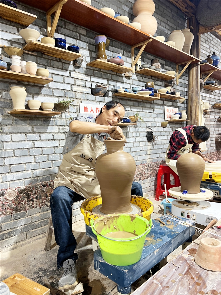 飞檐翘角、雕梁画栋,古色古香的基地中,200个制陶工位有序排列,游客可以在此体验铁店窑瓷器从碎泥、制坯、雕刻、上釉到烧制的全过程,近距离感受铁店窑文化的独特魅力。就算是手劲还不够的小朋友,也可以在村民制作的白坯上绘画。靠着独特的体验感,仅去年一年,泉口村就吸引5000余人次前来研学旅游,极大增强了旅游知名度。