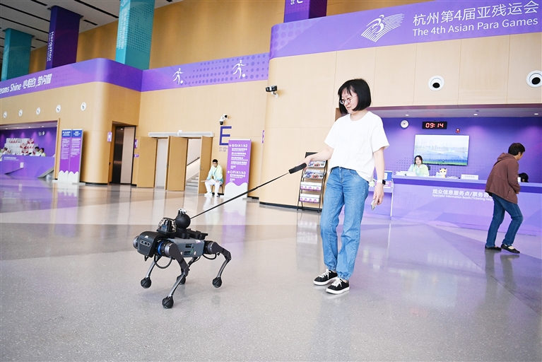 杭州亚残运会期间,在盲人足球比赛场地拱墅运河体育公园体育场,电子导盲犬“小西”为参加亚残会的残障人士提供服务。“小西”由西湖大学机器智能实验室研发,不仅把场馆地图铭记在“心”,还能“听懂”中英双语指令,自动规划出最优行进路径,使用者还可以通过牵引它的导盲绳绳端传感器来调节电子导盲犬的行走速度。