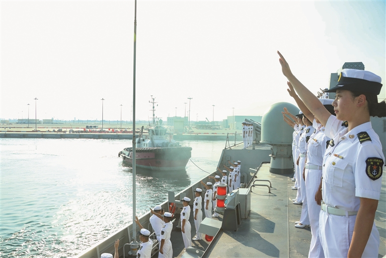 10月28日,编队淄博舰官兵向卡塔尔多哈哈马德港码头欢送人群挥手致意 新华社 发(张元虎 摄)