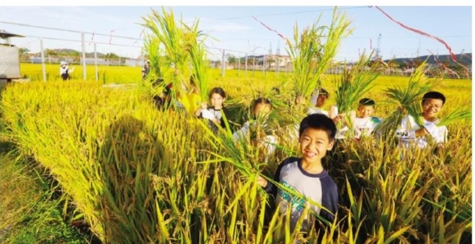 10月28日,市农业科学研究院马岙基地附近,水稻收割季,孩子们有的体验割稻,有的围在割稻机边上观看,沉浸式体验丰收成果 摄影 记者 张磊