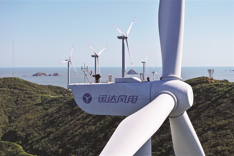 昨天上午,嵊泗县东绿华岛上,浙江运达风电的工作人员在机舱外例行检查,以保障风电机组安全稳定运行。绿华岛风力资源丰富,全年可利用小时数多,岛上13台风电机组错落有致,形成了集风力发电、观光旅游、环保示范于一体的风电长廊。据介绍,今年1~9月,绿华风电场已有3241万千瓦·时电量并入国家电网。