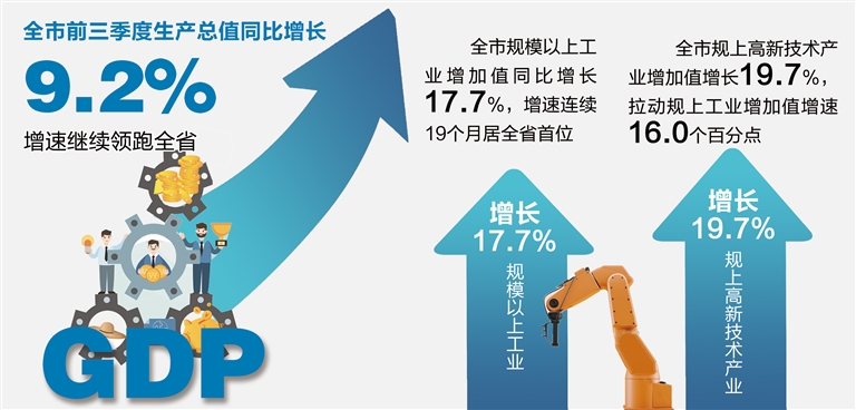 全市前三季度生产总值同比增长9.2%,增速继续领跑全省;全市规模以上工业增加值同比增长17.7%,增速连续19个月居全省首位……日前,我市交出了一份亮眼的前三季度经济“成绩单”,其中多项数据位居全省前列。透过这些数据,可以看出我市经济新优势正在加速形成。