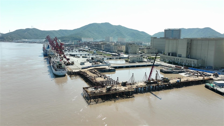 今年8月开工在建的西码头中心渔港公共补给码头,由1座码头平台、1座栈桥等组成,其中码头平台长110米,宽25米。目前栈桥上有5台桩机正在打桩(见图)。计划于明年6月18日前完工。