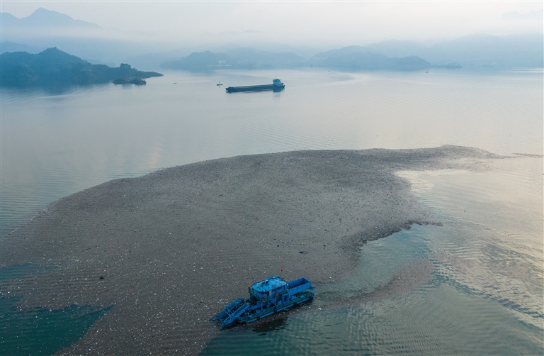 今年汛后三峡水库蓄水至175米水位以后,水库两岸消落带上的枯枝、秸秆、塑料等漂浮物聚集江面。位于三峡坝上库首的湖北省宜昌市秭归县积极组织清漂作业人员和机械作业船舶,进行全天候拦截清理,以确保三峡水库水质、船舶行驶和三峡枢纽运行安全。